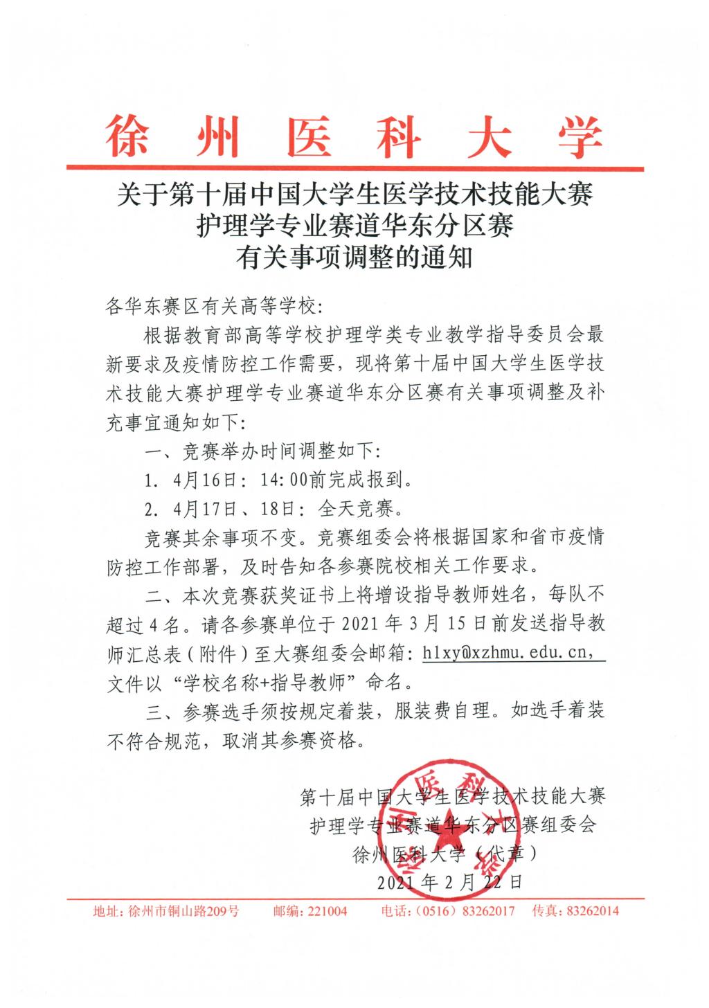 关于第十届中国大学生医学技术技能大赛护理学专业赛道华东分区赛有关事项调整的通知
