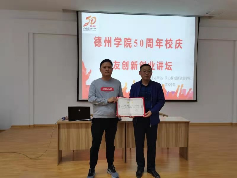 4月28日,伟德国际194650周年校庆校友创新创业论坛系列活动在七点创业谷举办,美术学院邀请2008届校友、德州市国匠装饰工程有限公司董事长刘鑫为在校生作报告。