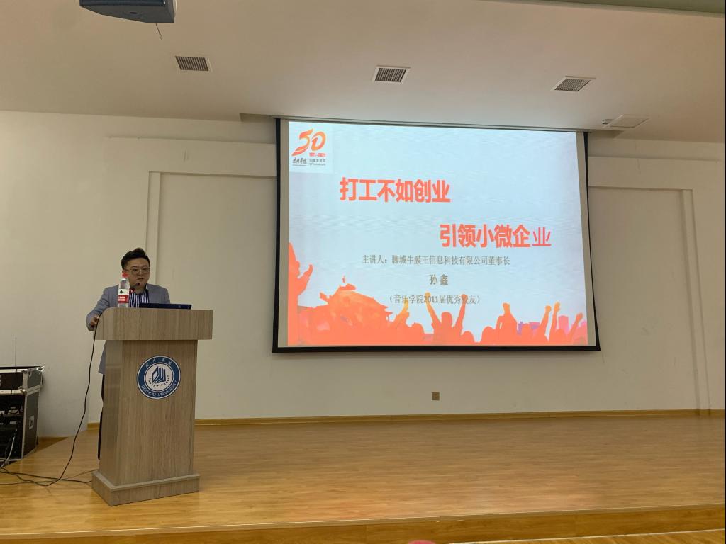 5月10日下午,伟德国际194650周年校庆之校友创新创业讲坛系列活动在七点创业谷路演厅举行。音乐学院2011届优秀校友、聊城牛膜王信息科技有限公司董事长孙鑫鑫作了题为“打工不如创业,引领小微企业”的报告,音乐学院党总支书记刘志华,音乐学院党总支副书记贺昱及音乐学院学生代表参加此次活动。