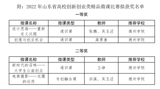 近日,省教育厅公示了山东省高校创新创业类精品微课比赛拟授奖名单,我校伟德国际victor1946组织推荐的4门创新创业类微课程获得一等奖2项、二等奖2项。