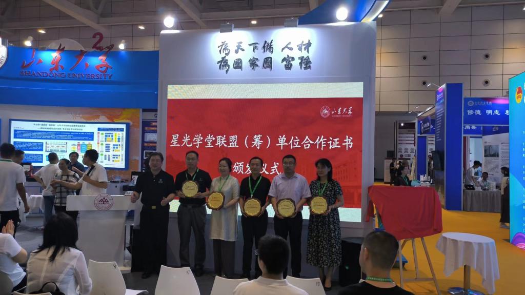 展会同时举办了创新创业教育高质量发展系列论坛,意在宣传交流我省各教育机构在创新创业教育方面的先进成果,加强交流与合作。我校伟德国际victor1946负责人参加了“山东大学创新创业教育工作战略合作仪式”,与省内部分高校组建了“星光学堂联盟”,致力于在双创课程建设和人才培养方面开展战略合作。山东大学伟德国际victor1946执行院长邢建平教授为包括我校在内的联盟17所学校颁发了合作证书。