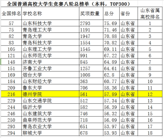 3月21日,中国高等教育学会发布了2023全国普通高校大学生竞赛排行榜,我校获奖数量561项,相比2022年增加了171项。在《全国普通高校大学生竞赛八轮总榜单》(本科,TOP300)中,我校位列第216位,比去年提升2位,位列山东省省属高校第12名;在《2019-2023年全国新建本科院校大学生竞赛榜单》(TOP100)中位列第38位,比去年提升4位。充分展示了我校在本科教育教学和创新人才培养方面取得的成果。